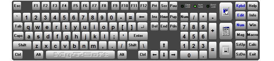 My-T-Soft TS is a Windows on screen keyboard utility that provides a powerful, reliable, and secure interface through ANY pointing device. It does so by delivering on screen keyboards, user macros, and complete control over computer and user functions.