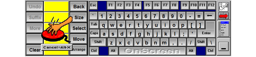 OnScreen has over 150 functions on 11 sliding panels in 12 base screen sizes with infinite larger sizes. Any panel grouping can be selected at any time. It remains active as a Button on the active application and runs under Windows 95 / 98 / Me / NT / 2000 / XP / Vista / 7 / 8 / 8.1 / 10 / 11 using minimal Windows Resources.